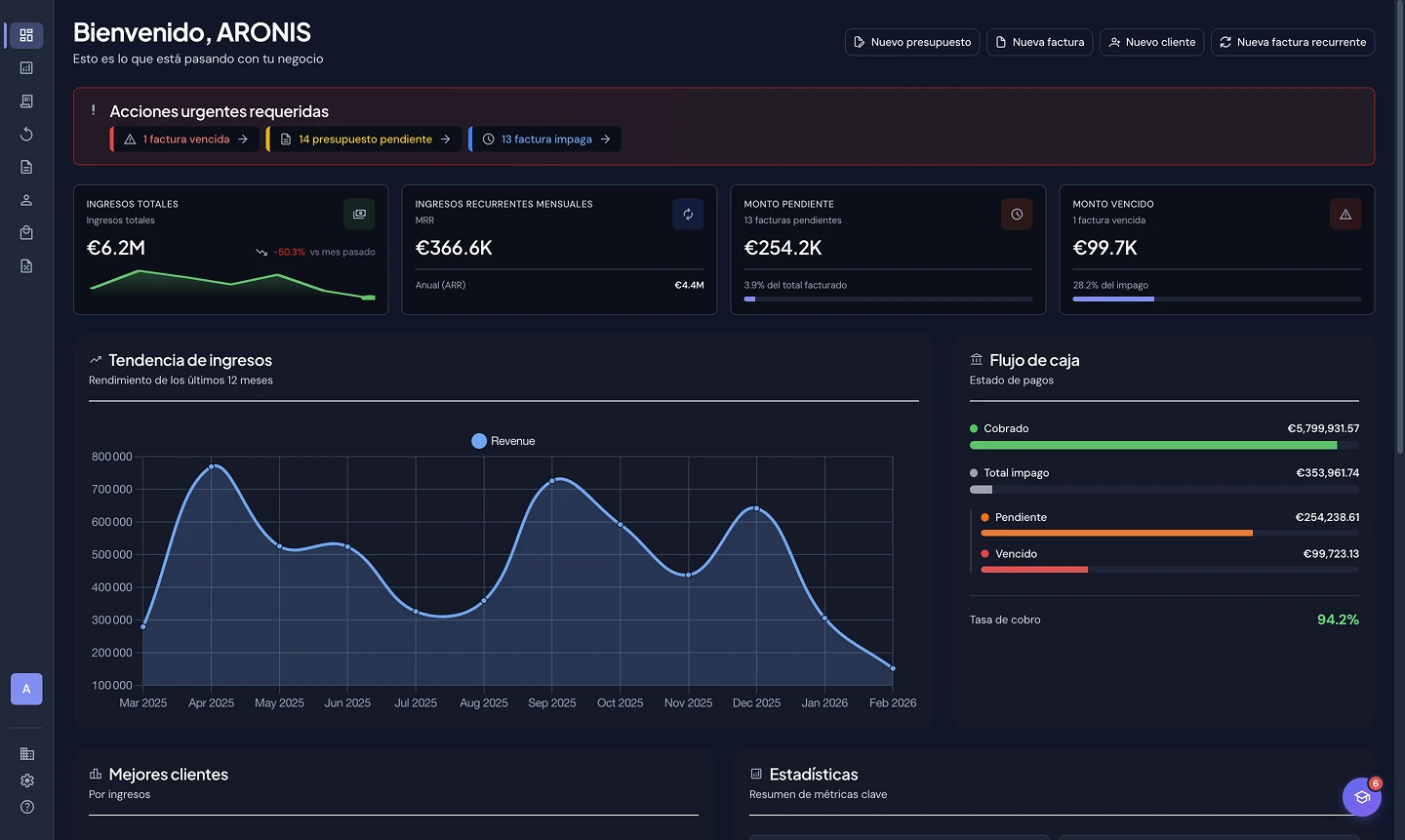 Presupuestos, facturas y pagos. Listo para la facturación electrónica 2026.